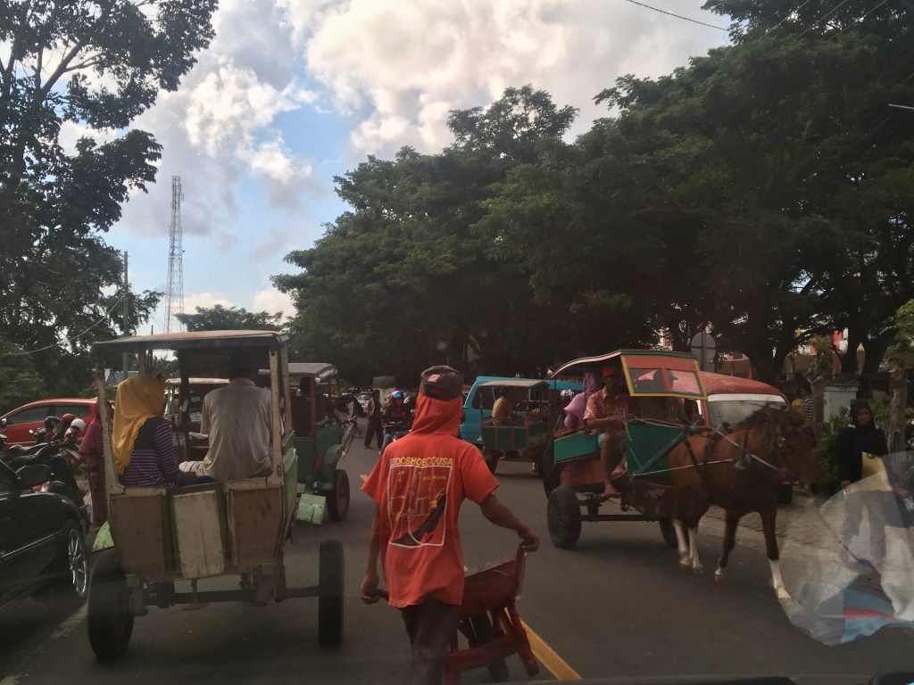 Depuis Jakarta, je prends un vol pour Makassar, et direction la gare routière en taxi (100K roupies) pour prendre le « collectivos » si on peut dire. Finalement avant d’arriver, on en croise un et après une petite négociation, je paie 200k roupies pour aller jusque Bira (le prix local est 100k mais bon après 3 avions et plus de 24h de voyage, je ne suis pas en super forme lol). Il faut 4 à 6 heures pour rejoindre Bira en fonction du chauffeur et des arrêts qu’il réalise. Le mien est très « fier » de m’avoir en passagère, il klaxonne pour « me montrer » à ses « copains » chauffeurs et leur dire qu’il m’emmène à Bira!… Les autres passagers sont des femmes, nous essayons de communiquer mais c’est assez difficile. Ils ne parlent pas anglais et je ne parle pas indonésien (merci google translate), mais s’enthousiasment et exigent au chauffeur de me montrer quelques lieux.