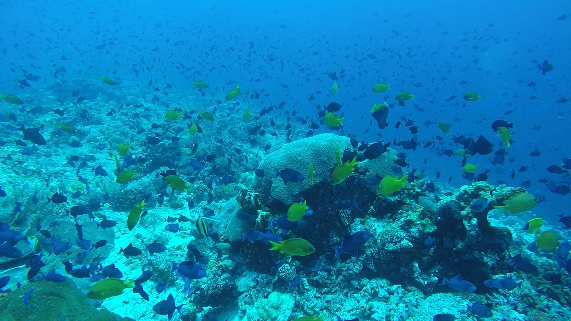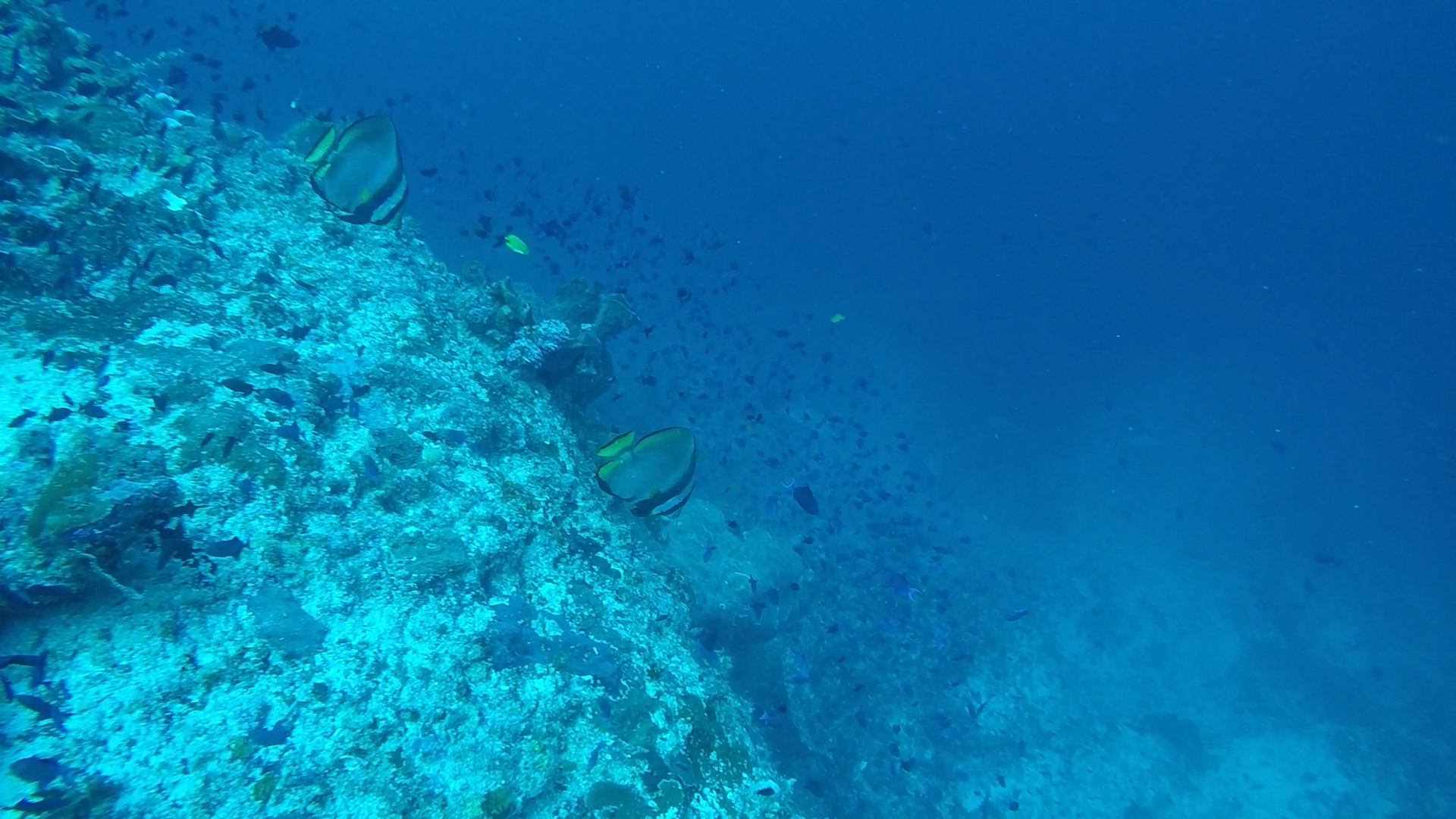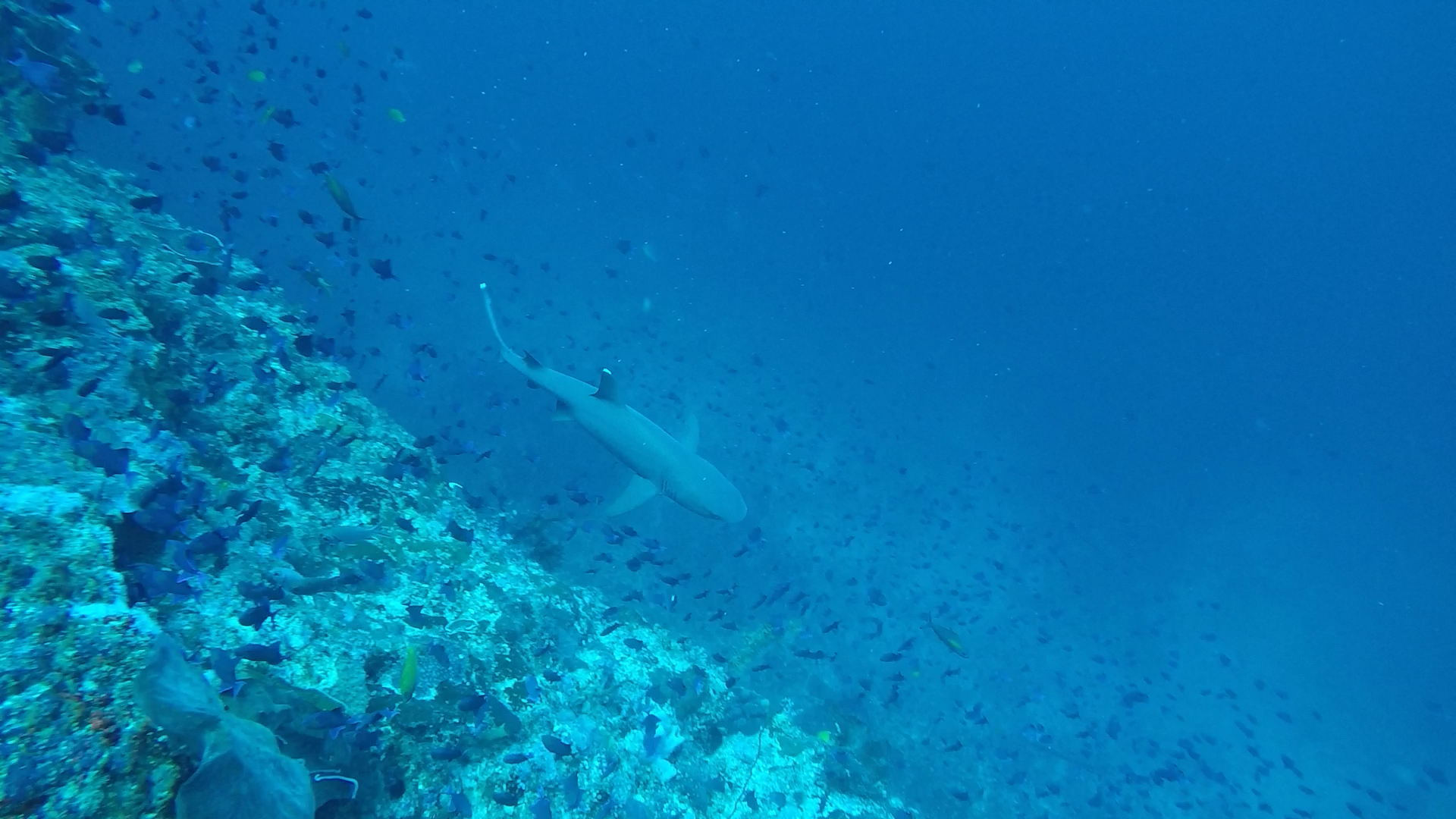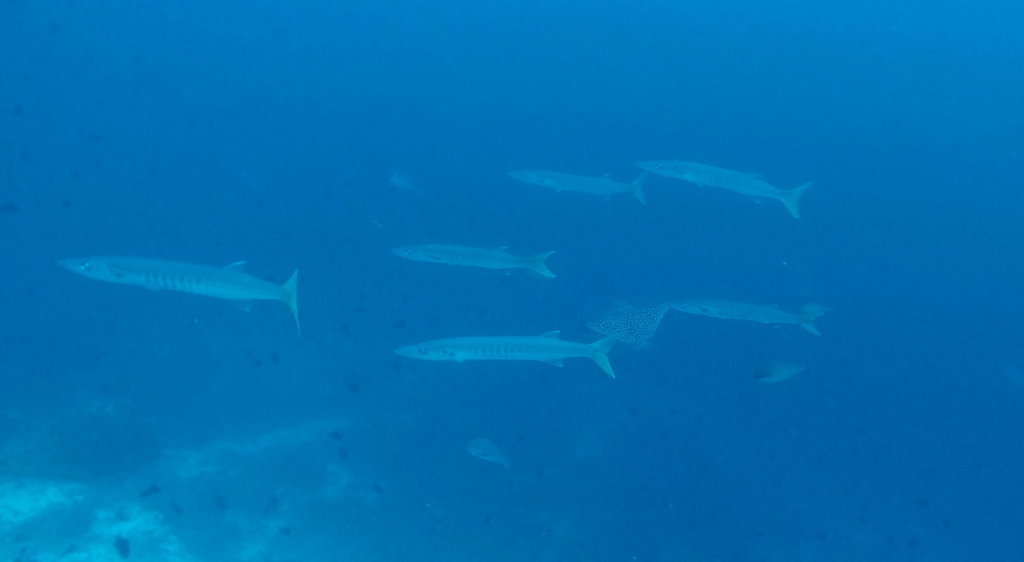 L’un de mes sites préférés a été Eagles Rock; à peine descendus, nous voyons 2 napoléons, puis des requins pointes blanches et requins gris de récif; des barracudas d’environ 1m ou plus (difficile à évaluer) et arrive une raie aigle qui s’approche puis repart dans le bleu! Il y a également un nombre incroyable de poissons, notamment des milliers de balistes bleus !