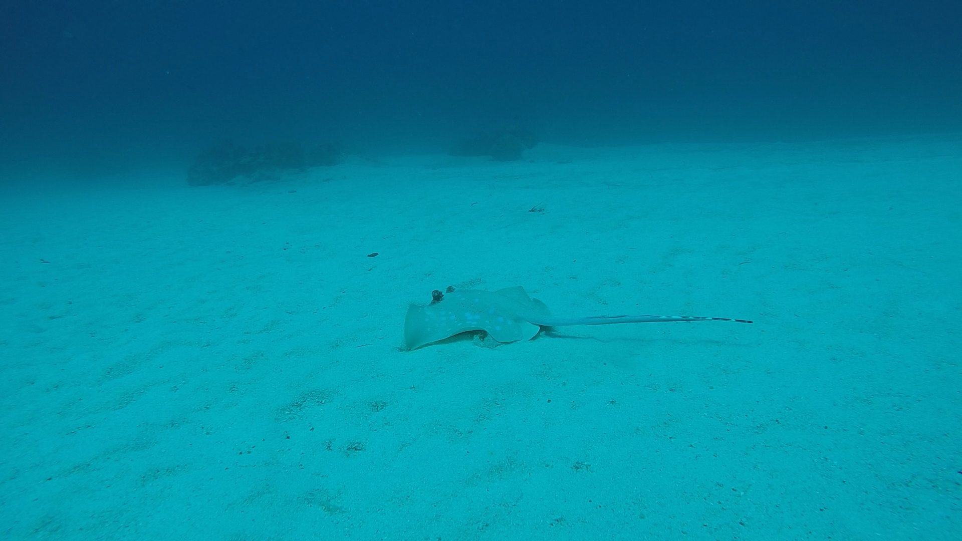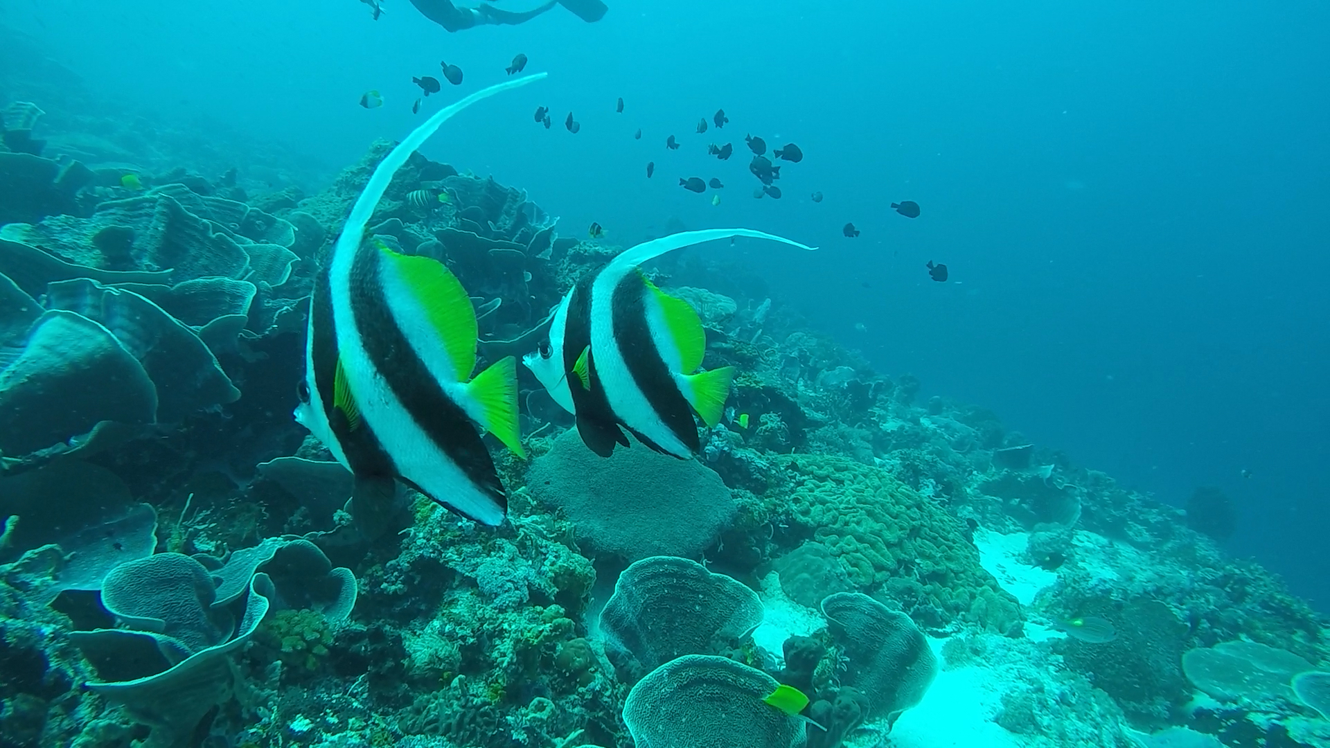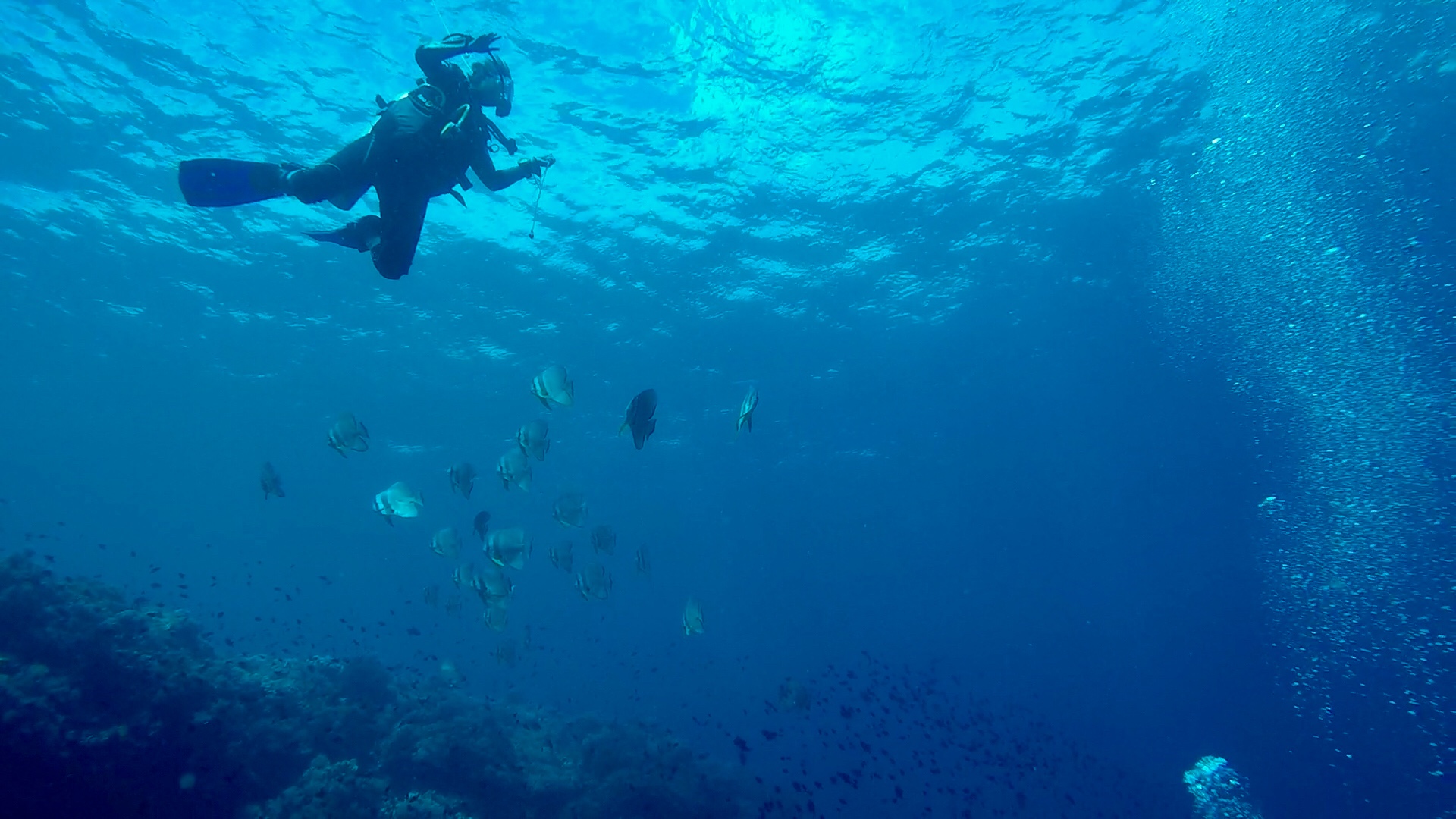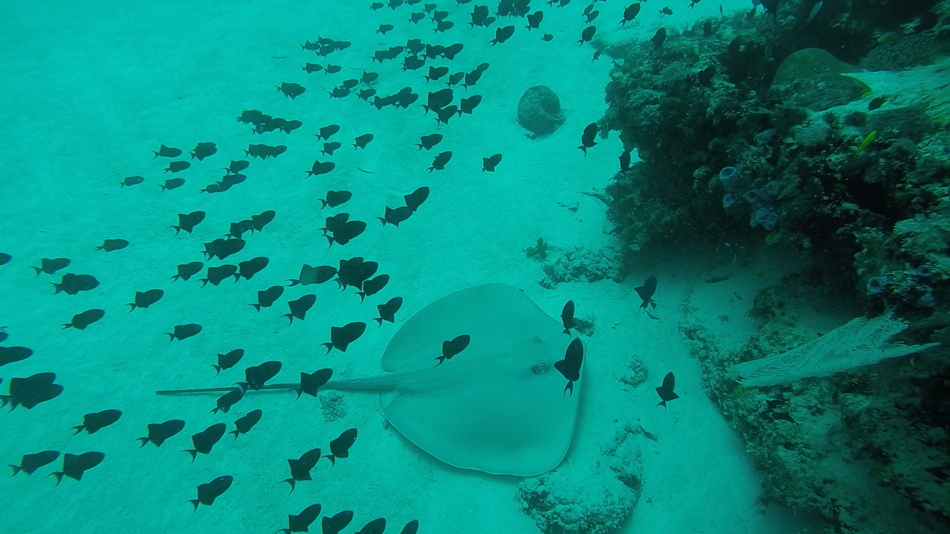L’un de mes sites préférés a été Eagles Rock; à peine descendus, nous voyons 2 napoléons, puis des requins pointes blanches et requins gris de récif; des barracudas d’environ 1m ou plus (difficile à évaluer) et arrive une raie aigle qui s’approche puis repart dans le bleu! Il y a également un nombre incroyable de poissons, notamment des milliers de balistes bleus !