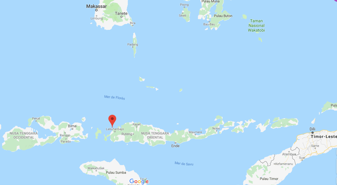 L’île de Flores se situe à l’Est de Sumbawa et Komodo, à l’Ouest de Lemabta et Alor et au Sud-Est de Timor: