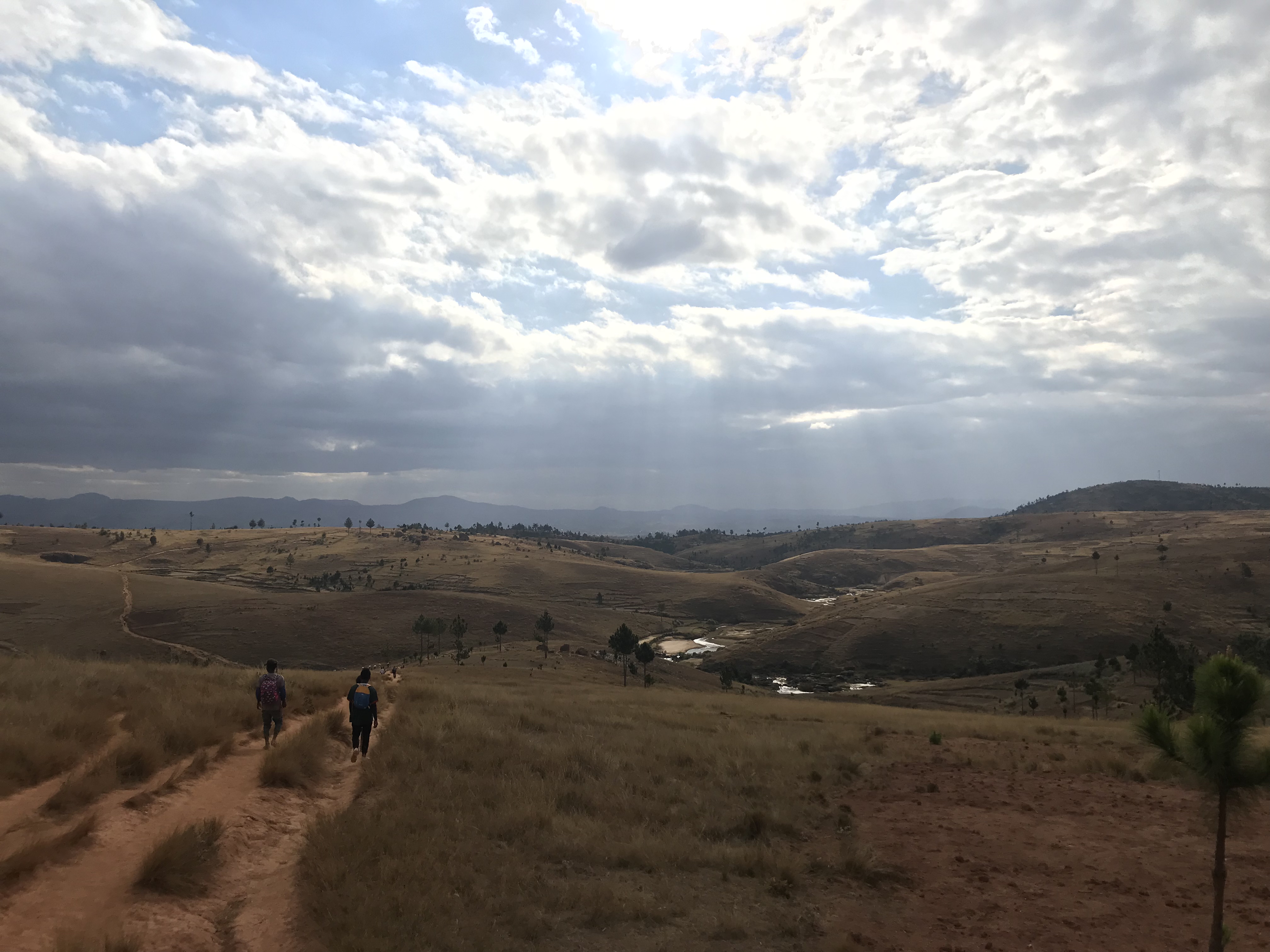 Nous ne sommes pas totalement rassurée mais c’est l’occasion de découvrir des traditions au cœur du pays. Après un passage rapide au marché local pour acheter quelques bananes en guise de déjeuner, nous nous rapprochons au plus près du village avec la voiture et continuons à pied dans les collines à travers les rizières. Les paysages sont superbes, nous croisons plusieurs habitants sur ce chemin, des enfants allant à l’école, des femmes transportant sur leur tête des vivres,…
