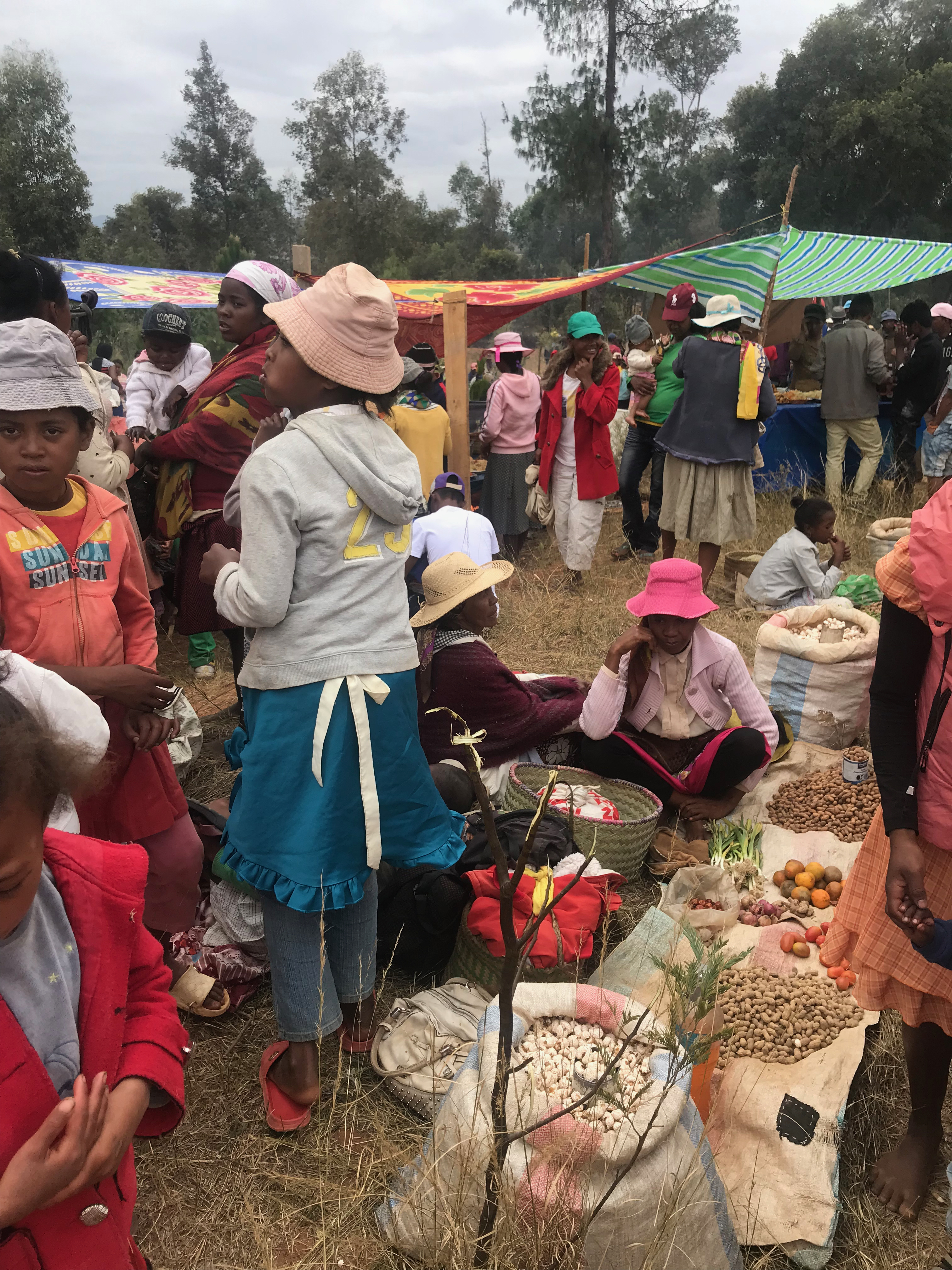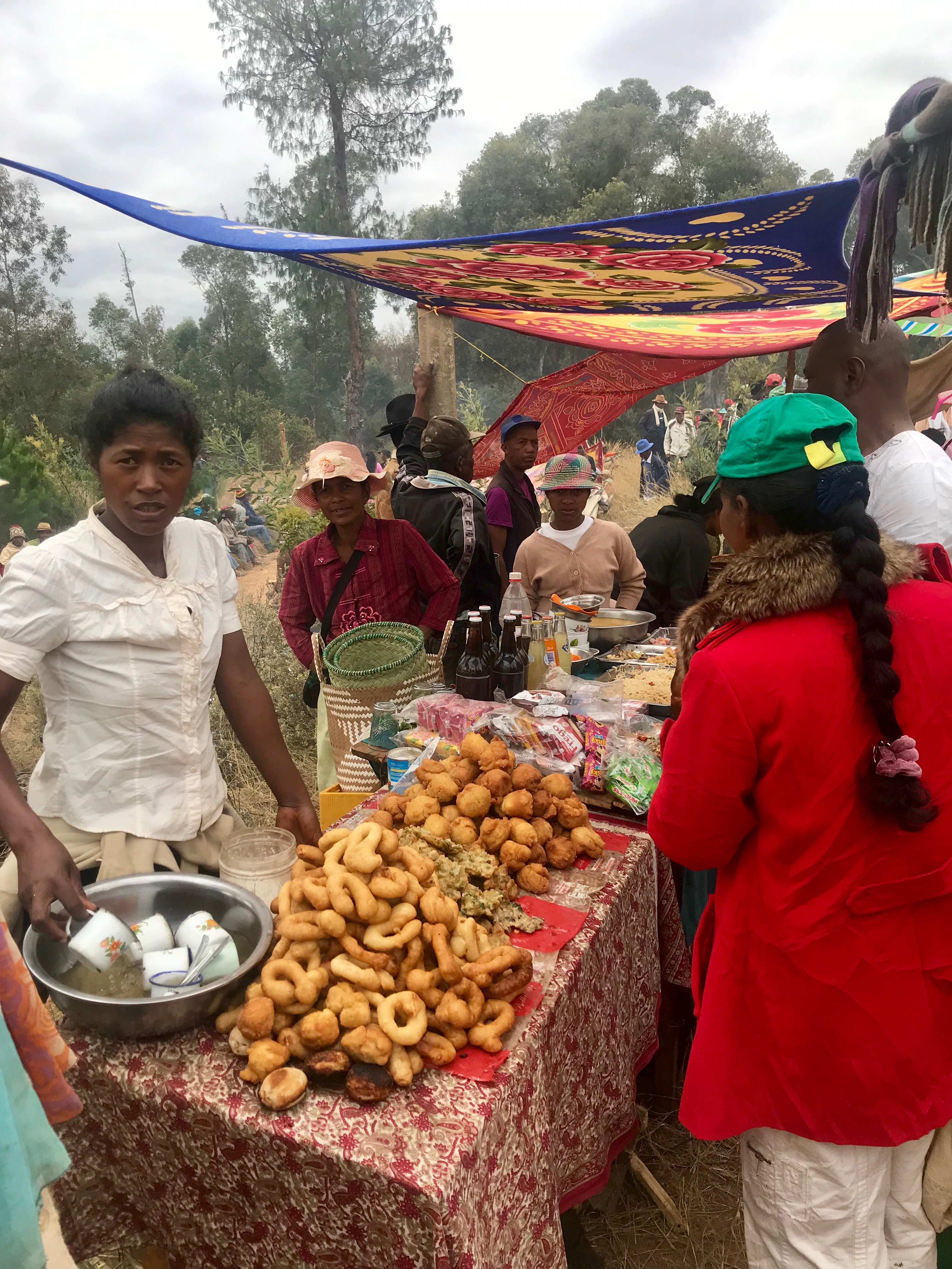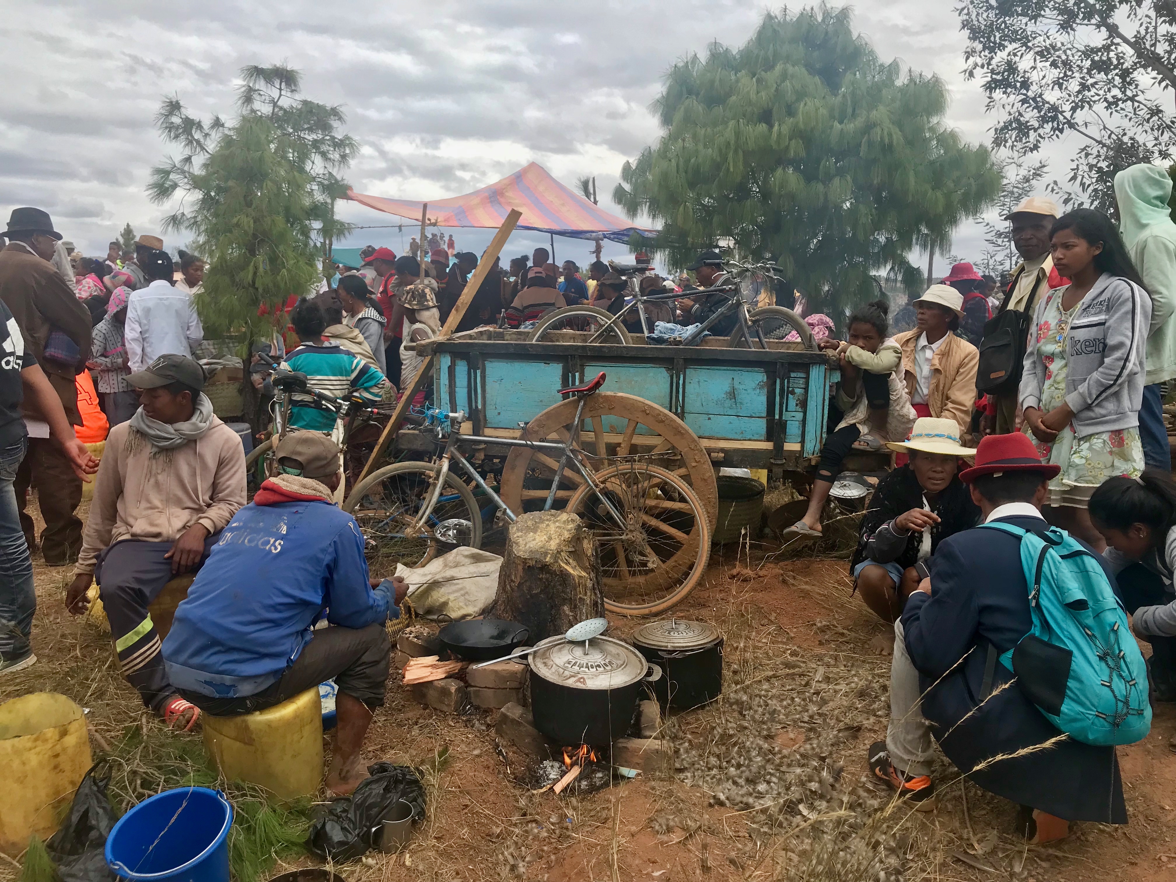 Après 3 à 4h de route, nous arrivons à Antsirabe, ville des hautes terres de Madagascar de la région de Vakinankaratra et d’environ 260 000 habitants. Après avoir discuté avec un « homme zébu », Fénu nous propose de découvrir une fête traditionnelle dans le petit village de Amboamanabe à 1h marche : le retournement des morts ou Famadihana !