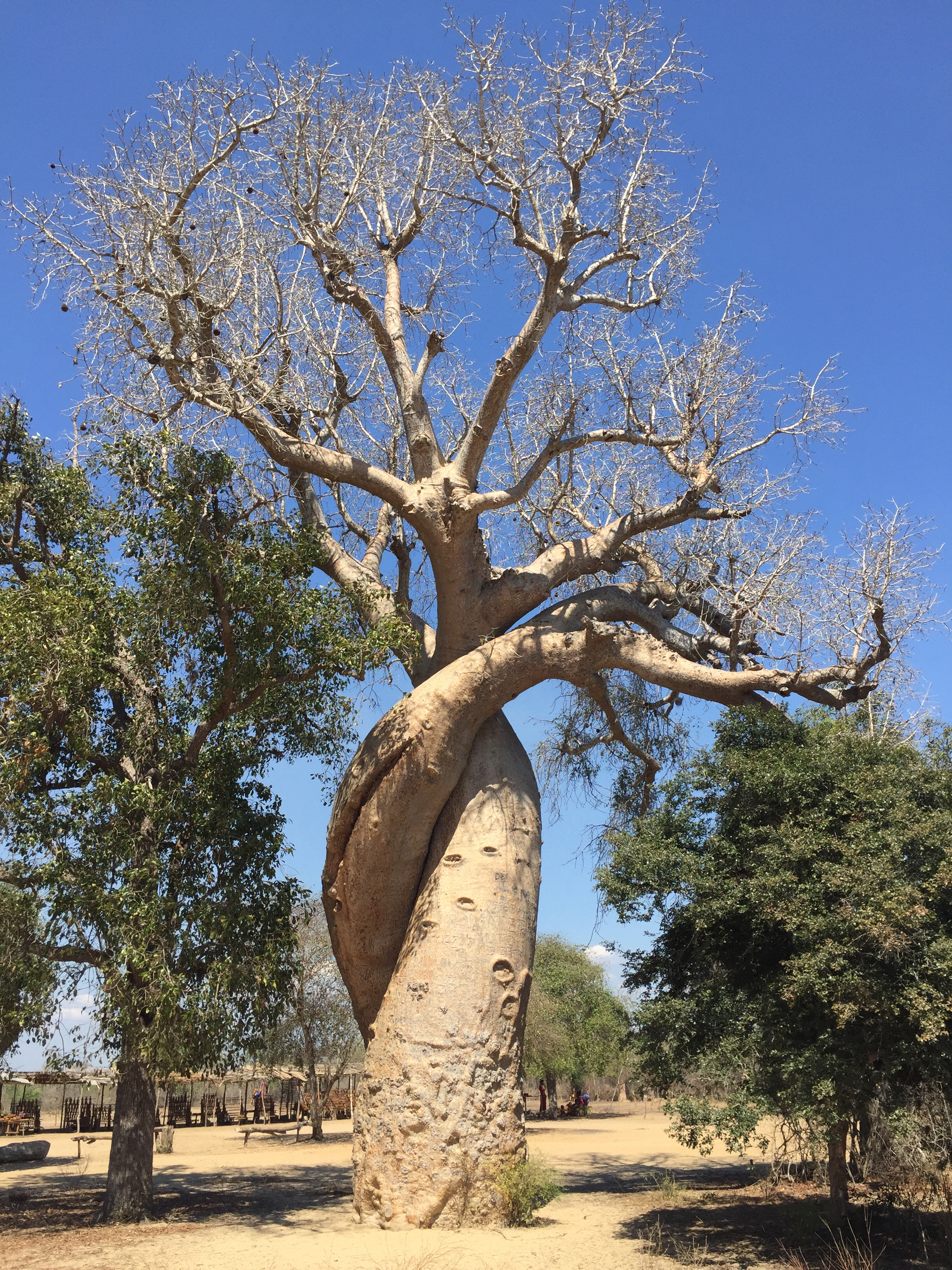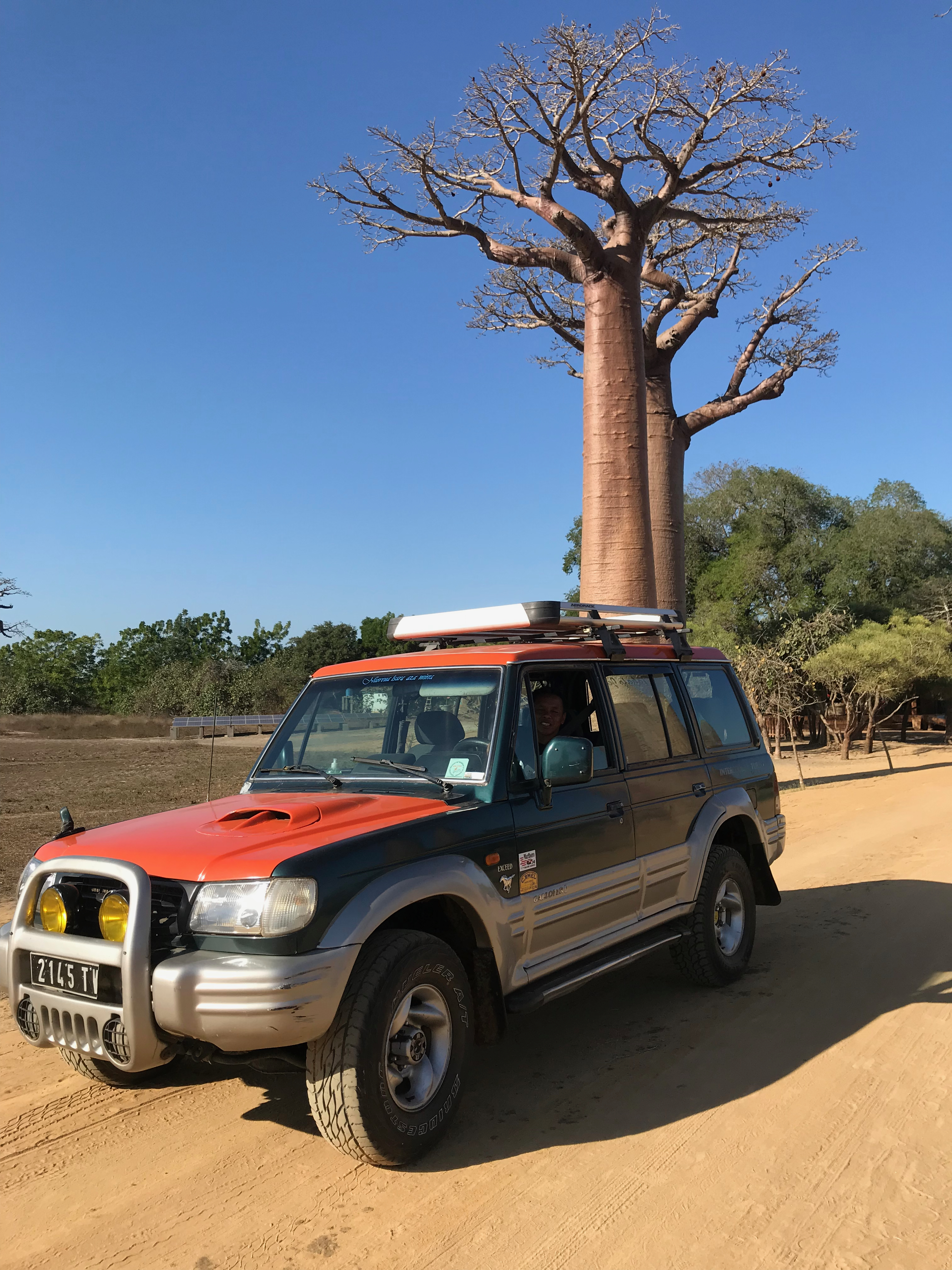 Nous continuons cette longue route difficile mais qui est une vraie expérience que je recommande et que nous apprécions 🙂 Nous approchons de la célèbre route des baobabs. Les premiers se dessinent au loin…, leur forme atypique est impressionnante: tronc large et haut avec à son extrémité cette amas de branches!